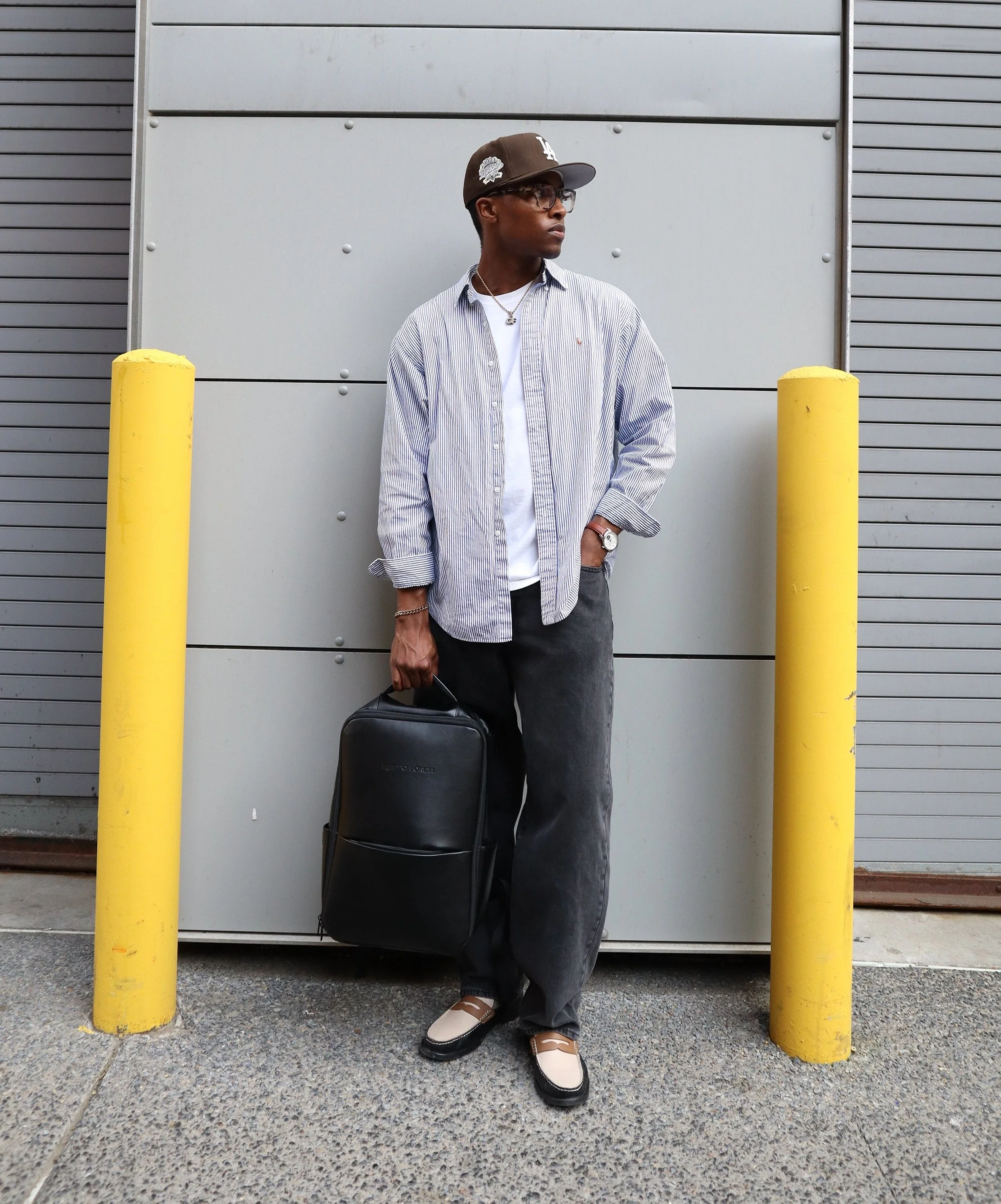 Filippo Loretti is a watch and lifestyle company based on Italian heritage. The chosen outfit was styled around the watch and backpack present in the photos. By combining a button-down shirt with a fitted baseball cap, my goal was to elevate the outfit while keeping it casual enough to be worn in any setting. Styled and shot by myself.
